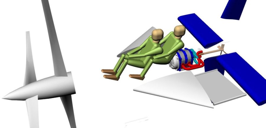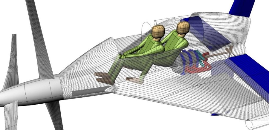 The two rotor Mazda Wankel engine is behind the pilot and passenger and drives the coaxial props with a carbon fiber drive shaft removed from a Mazda RX8. The Mazda Wankel rotary engine is the only intermittent internal combustion engine with a power to weight ratio of well over one and durable enough to use in an aircraft. It has a 20% lower fuel burn per HP generated than a small turbo prop engine at only a slight weight penalty. It has a 35 year history of being used in aircraft and over two million engines have been produced for the automotive market. Dozens of light aircraft are now flying powered by the Mazda Wankel rotary engine. The RX8 version is currently selling at the rate of 65,000 engines a year. It is also very low cost for an aircraft engine. A Mazda rotary powered four place airplane achieved 205 MPH average in a recent 500 mile air race while burning only twelve gallons per hour.