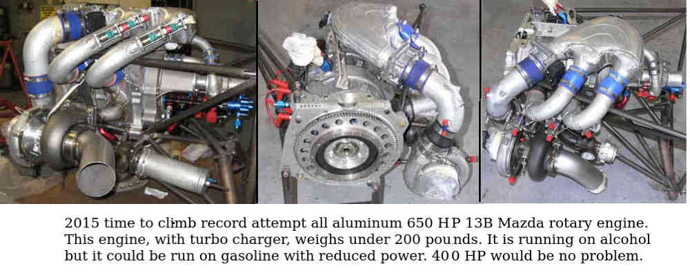 The high power to weight ratio of the all aluminum Mazda 16B Wankel rotary engine and low fuel consumption compared to a small turbo prop engine combined with carbon fiber aircraft construction has made practical scaling down old vertical take off aircraft designs that did not enter production in the 1960's. The all aluminum Mazda 16B engine introduced in October of 2007 weighs about 185 pounds and is capable of about 285 HP at 7500 RPM.