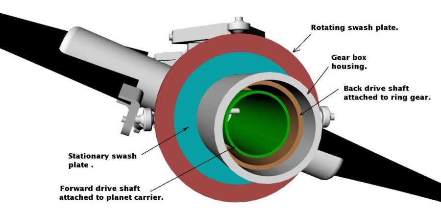 This gear box is stunning in it's simplicity. Since we are proposing using the A/C proved Ford eight pound A4OD six pinion planetary in a differential mode the total gear reduction is 6.34:1. See http://www.rotaryeng.net/psrus.html. The ring gear is rotating in one direction and the planet carrier is rotating in the other. As long as both props have the same drag the RPM's of each prop will be equal. With an engine RPM of 8000 the rotors will be turning 1262 RPM for take off. I would use a 13 foot diameter rotor at this RPM.