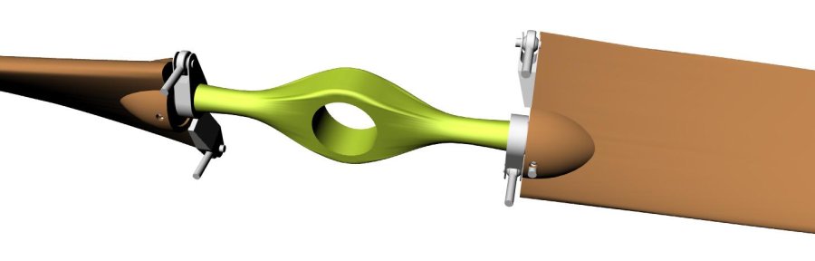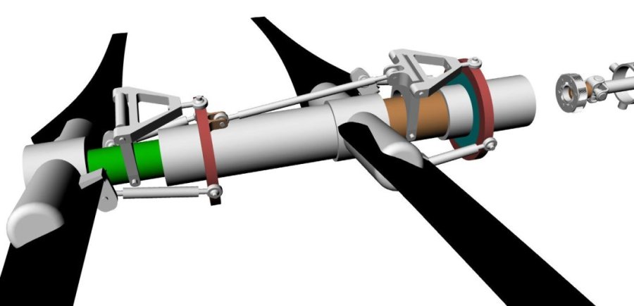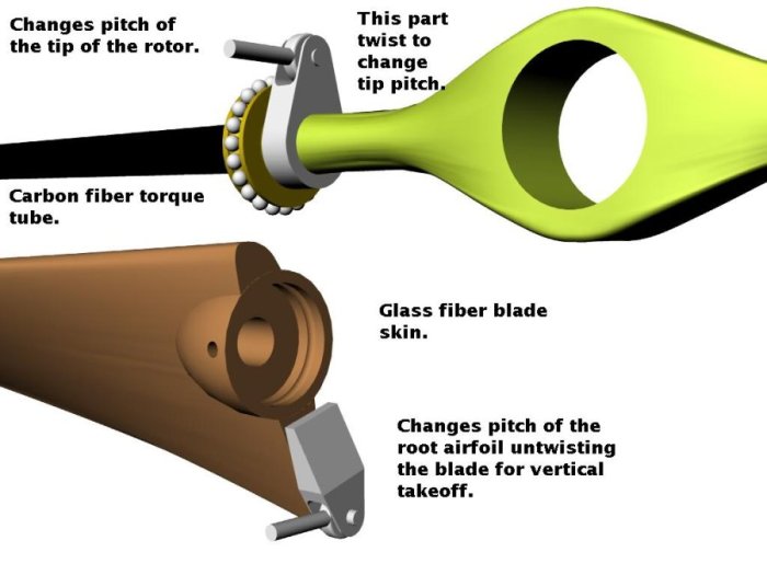 Since we will not be flying forward in helicopter mode for long or at high speed the leading and lagging hinges can be done away with. Same goes for the flapping hinges so we can use Glass Reinforced Plastic for the hub and outer blade skin. The same as several European helicopters use. GRP has high tensile strength and a low modulus of elasticity allowing it to flex without failing. The innovative feature of having a one two piece carbon GRP blade with internal carbon fiber torque to allow twisting the blade is a break through. More about the reason for this shortly. The outer bearing race is also an innovative feature. The connection between blade and hub is achieved by the bearing balls and they are fed into the races by one access hole on each side. We have used this feature in the past on an aircraft propeller design and it works well.