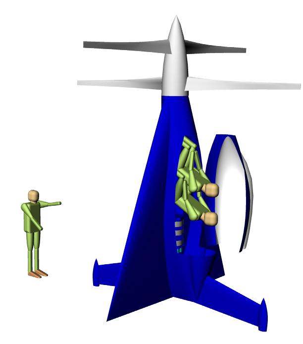 No vertical takeoff design would be responsible without some consideration of saving the pilot and passengers in the event of a mechanical failure during the landing and takeoff modes. If you used two air bags shaped like this mounted on a person's shoulders and it was 24 feet in diameter the frontal area would be 452 square feet. Given a drag factor of approximately one and a person weight of 250 pounds the free fall speed would be drag = V^2 x 452 x .0026 = 250 = man's weight.