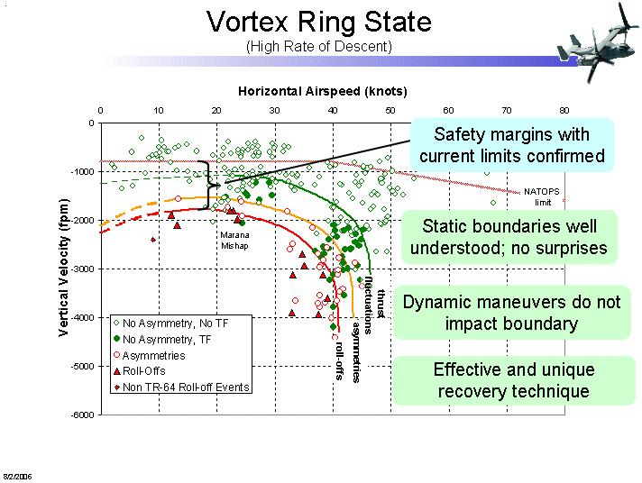 No discussion on the controversial V22 tilt rotor would be complete without a discussion on Vortex Ring State or VRS for short. An issue has been made about the V22 Osprey's 47 degree blade twist and how it affects the Vortex Ring State. Unlike a helicopter high blade twist is necessary in a tilt rotor to get good propeller efficiency at high speed. This high twist can cause blade stall in the vertical landing mode. I also suspect it affects the ability of the V22 to auto rotate.